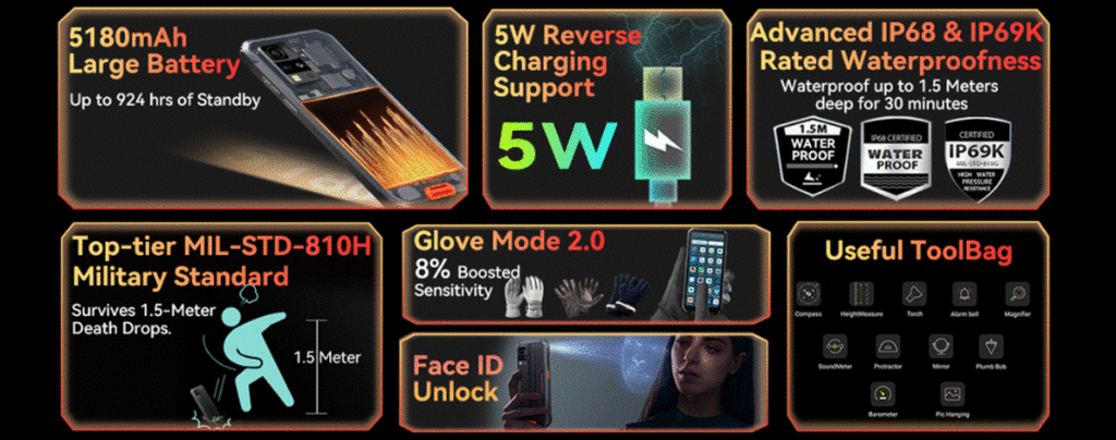 - กันน้ำ กันฝุ่น IP68/IP69K – ฝนตกหนัก ตกน้ำ หล่นลงคลองก็ยังใช้ได้