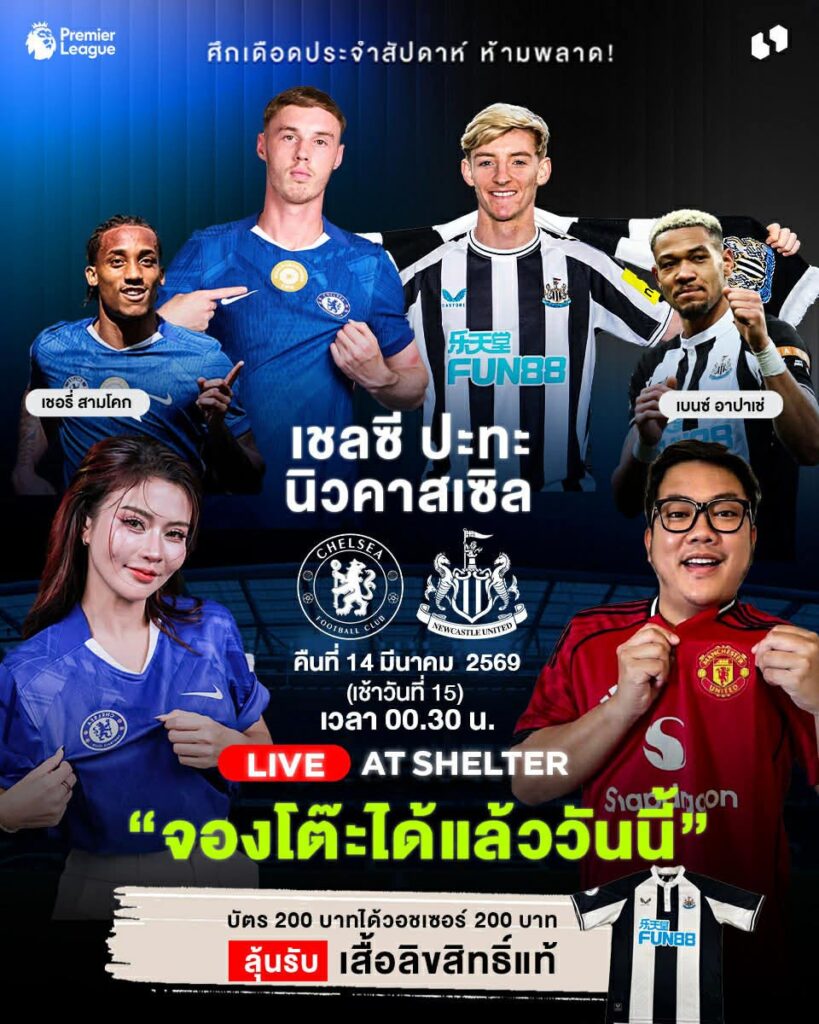 เพจ Play with FUN, be FUN สื่อกีฬาและไลฟ์สไตล์ชื่อดัง เดินหน้าสร้างประสบการณ์ฟุตบอลระดับโลกให้แฟนกีฬาไทย ล่าสุดร่วมมือกับร้านเชลเตอร์ (Shelter) ร้านอาหารยอดนิยมใกล้วงเวียนใหญ่ จัดกิจกรรมพิเศษให้แฟนบอลได้ร่วมเชียร์เกมบิ๊กแมตช์ระหว่าง เชลซี พบ นิวคาสเซิล ยูไนเต็ด ในคืนวันเสาร์ที่ 14 มีนาคม 2026